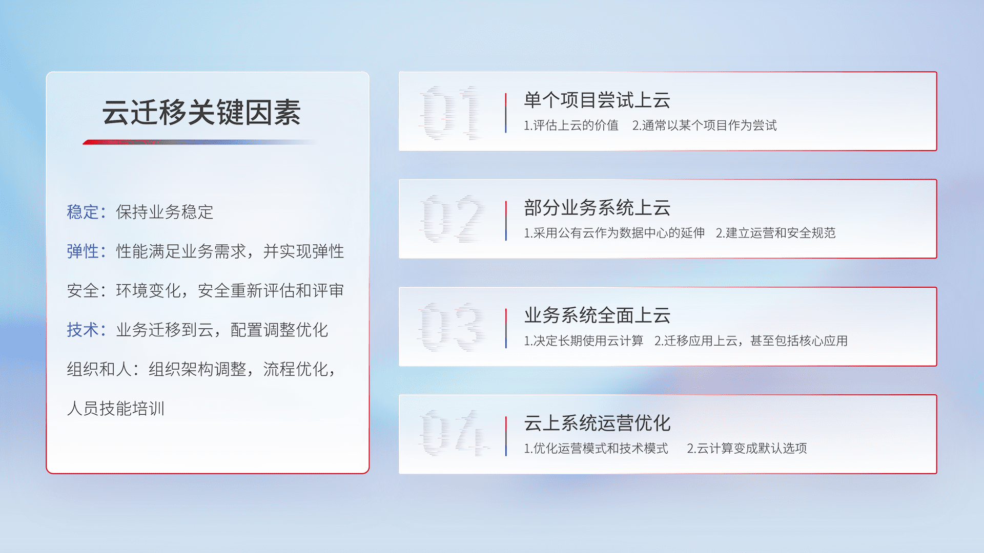 结合实际业务,,,从规划设计、、云平台选型、、、、云原生改造、、、数据迁移、、、、集成交付,,迁移全过程为客户识别最佳上云路径,,做好风险识别管理,,,,设计网络架构、、身份权限、、安全审计合规、、操作审计、、、、日志审计、、、监控告警策略、、多站点容灾设计等,,,,对云上基础设施进行整体规划,,,提升IT治理水平,,,,以满足弹性、、、高可用、、高性能的需求。。