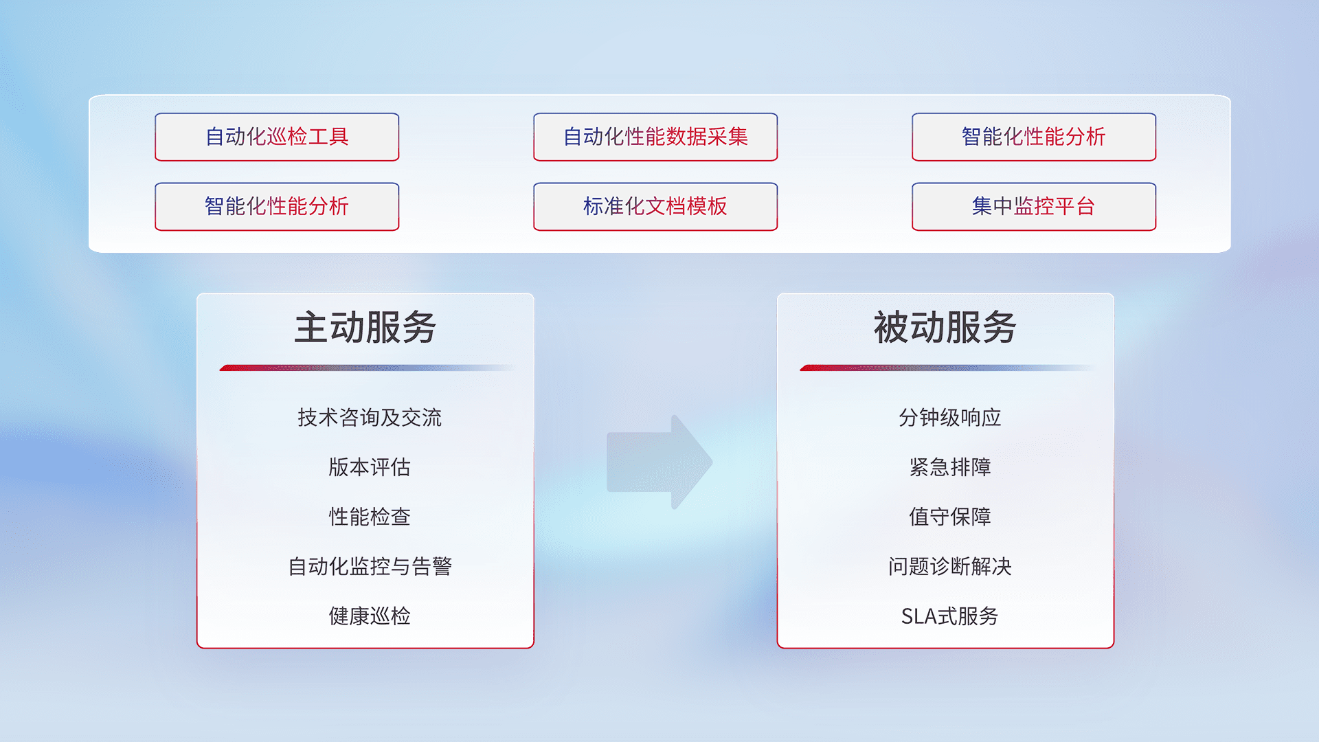 智能化工具和标准化文档,,保障服务质量,,,,提供主动服务(包含技术咨询、、、、版本评估、、、、性能检查、、自动化监控与告警、、、、健康巡检)和被动服务包含(分钟级响应、、、、紧急排障、、、值守保障、、、问题诊断解决、、、、SLA服务)。。
